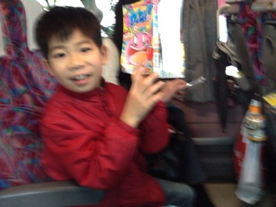Johnくん、読みながら行くそうです。 二号車バス組