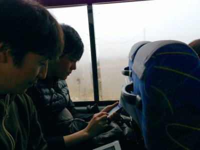 賛美リーダーの三本松牧師と森牧師は、車中で会衆賛美の選曲中です。