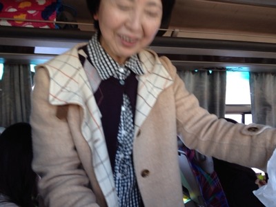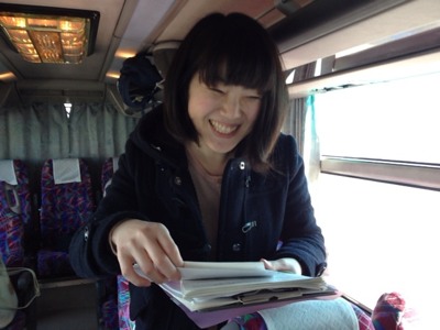 CSのゆみちゃんは担当者に資料を配布。 二号車バス組