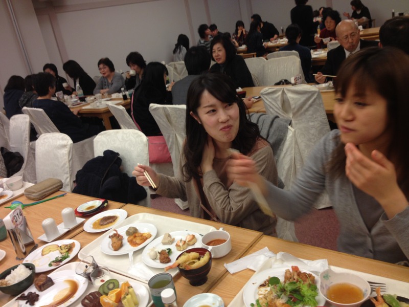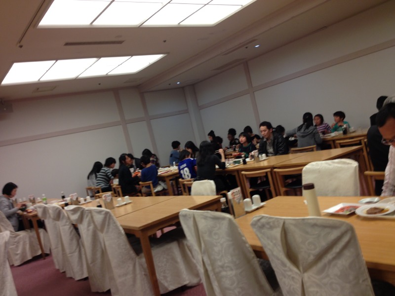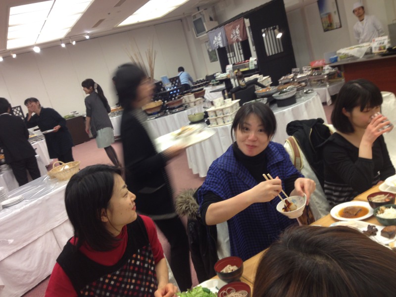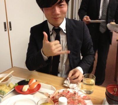 はじめ君は皿に大量のエビを持って来て、ひたすら食べて、みんなに気持ちがられています。