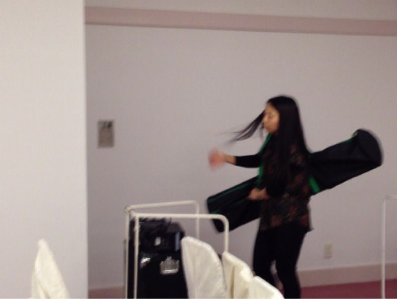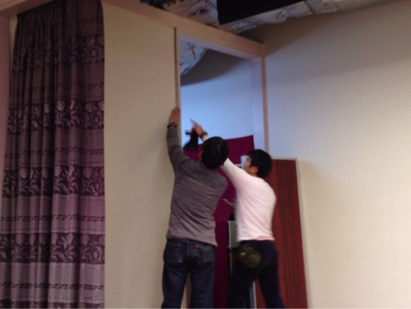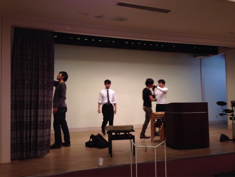 機材撤収と、舞台上の出入り口寸法を調べているスタッフの方々。 次回への準備でしょか?