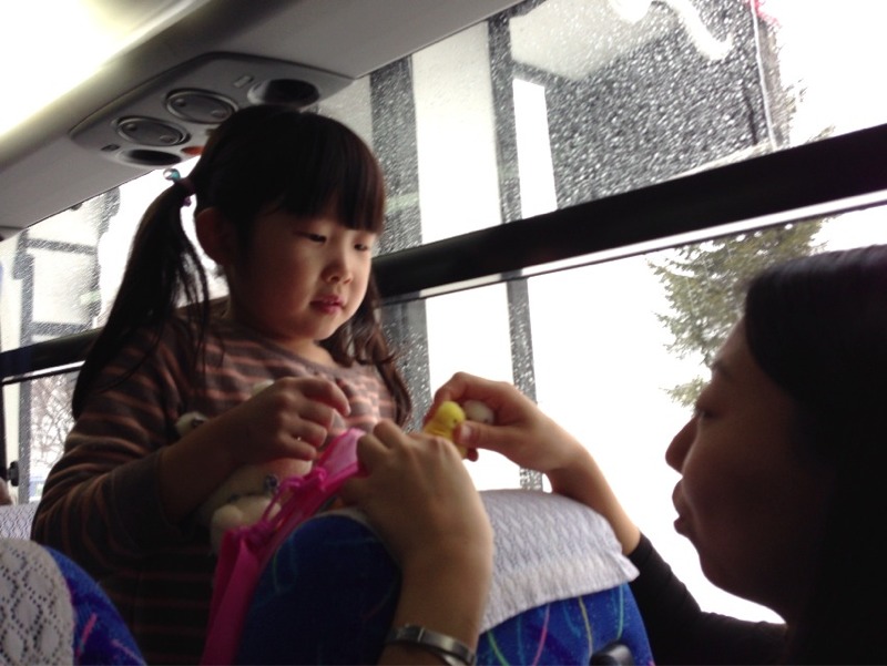 バスの前と後ろで仲良しお友達。シオンちゃんがかくれんぼをしています。