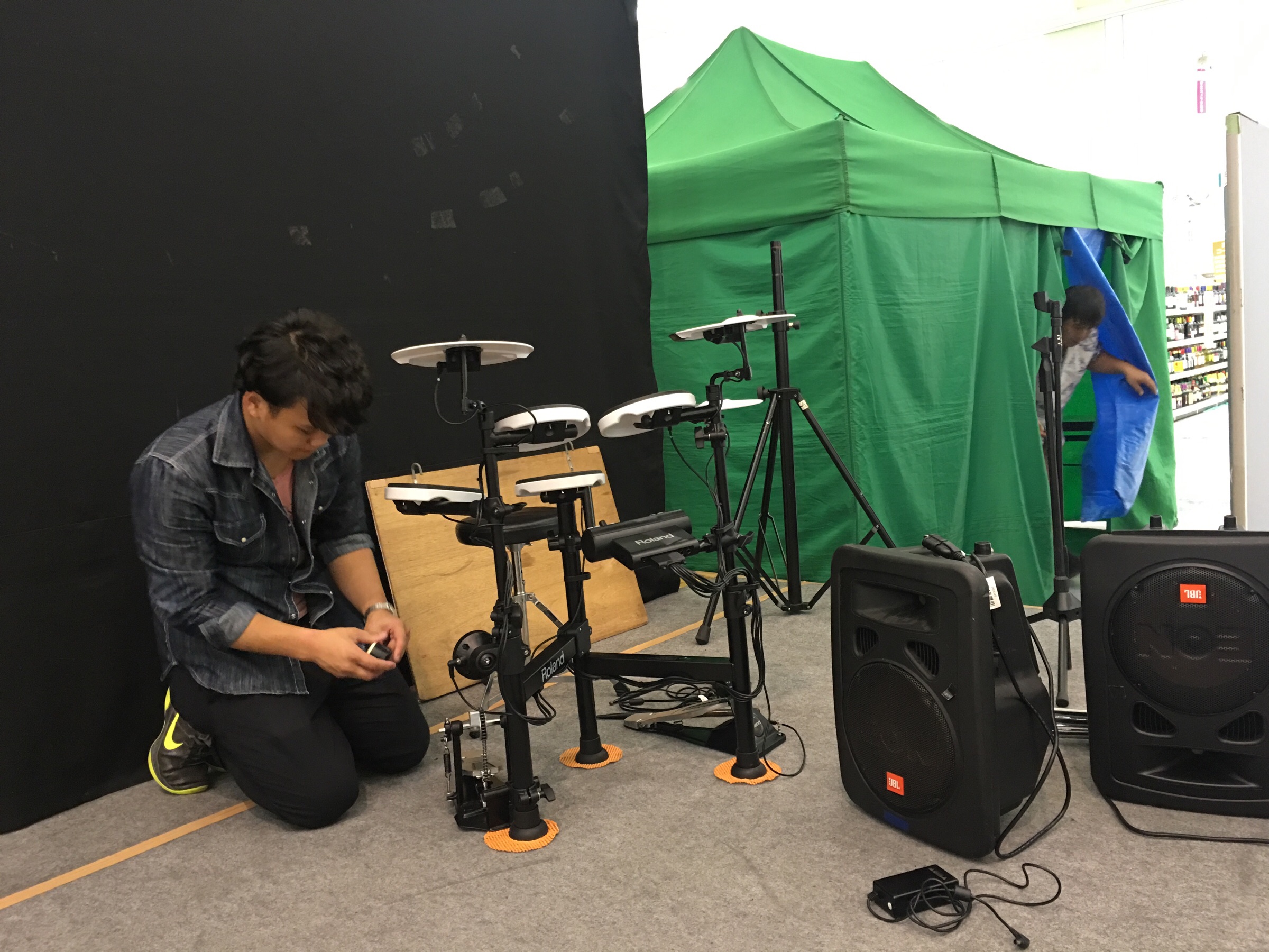 まずはドラムからセッティング。あっちゃんとサラちゃんが叩きます。