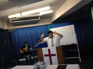 会堂では礼拝が行われています。 沖縄出身の真境名牧師がメッセンジャーです。