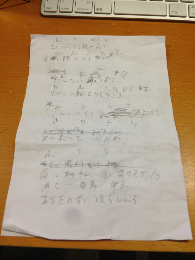 浮かんだ歌詞とコードをメモ書きします。が、いつもの事ですが 読めない字が多々あります。 自分で書いたのに…。