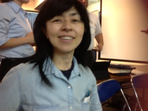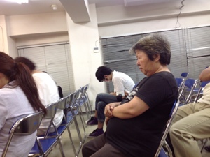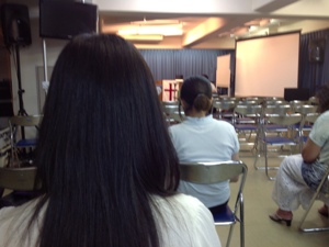 「真境名牧師も、iPadで作ってみてください。」と説明中。ちなみに、Jさんのは、ギター、ドラム、バイオリン、ビオラ、チェロなど入れてみました。オケ的には、最後のバイオリンとビオラの部分が気に入っています。