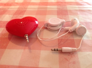 iPadのアクセサリーが100円ショップにありました。スピーカーとイアホンです。スピーカーが、なぜか赤色のハートです。締切が伸びたので、もう少し作ってみようかと思っています。ph