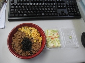 きょうの事務局でのお昼ごはんはそぼろ丼。50円のコールスローもゲット出来ました!