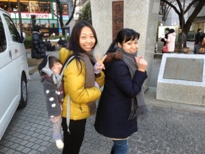 パトリスと共にチラシ配りしました。祝福です。寒い中ですが、こんな会話が。まどか牧師:真理子さんって、あったかそう〜。すると即、真理子さん:まどかさんってあったかそう〜!と返していました。何かのバトルになるといけないと感じたのか?(笑)ゆみちゃんがやってきて無事に写真撮影!freedomとHyssopと社会人会チームのエステル