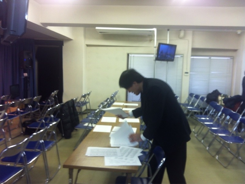 今日の審査員のお一人。テモテ山川牧師が審査員席の準備をしています。