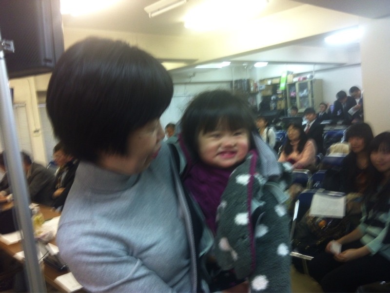 賛美が聞こえてニコニコのEちゃん。現在ベビーシッター中荻原さん。