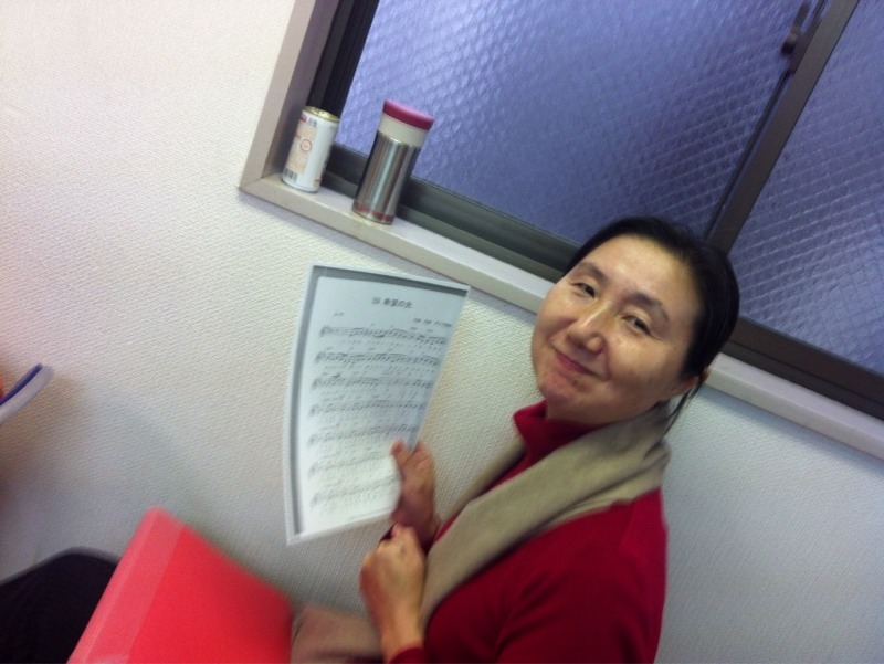 ランチしながら楽譜もチェック中のラスポーザのみきこさん。ここは、みきこさんの月曜日お気に入りのお席。窓の所は、ドリンク置き場です。マイルームな感じ。