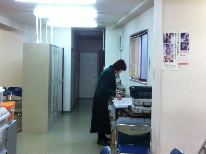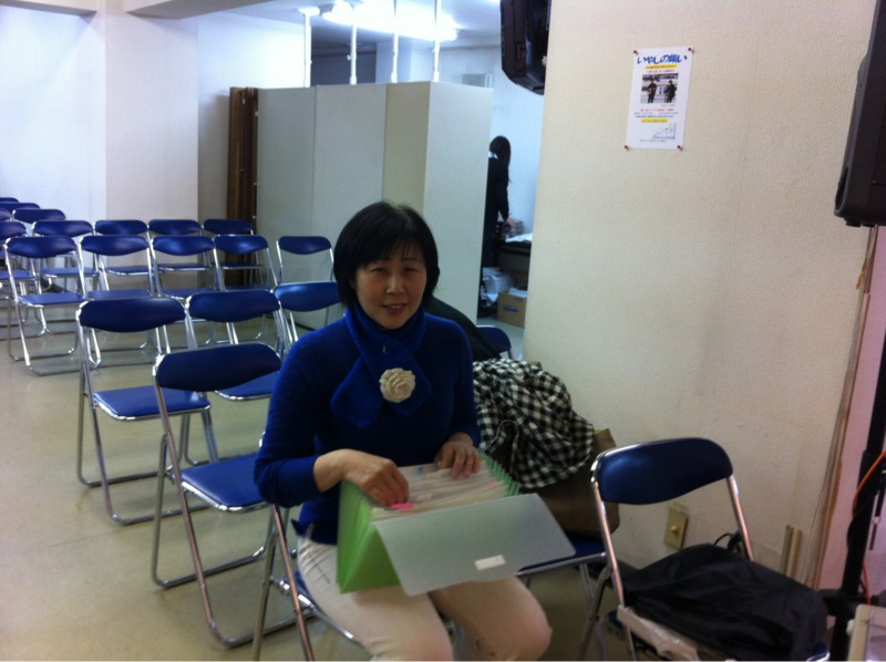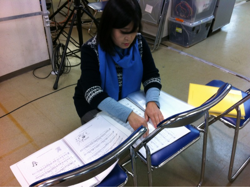 会堂では、婦人会チームの則子さん、急いで楽譜を用意しています。