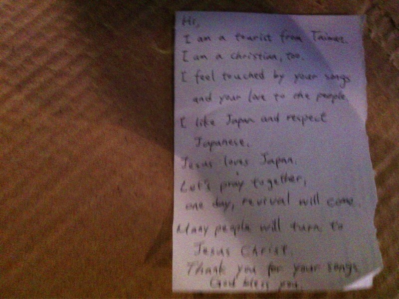 路上賛美を聞いていた外国のクリスチャンの方が、賛美に感動されたことをお手紙に書いて渡してくれました。 主にご栄光をお帰しいたします!