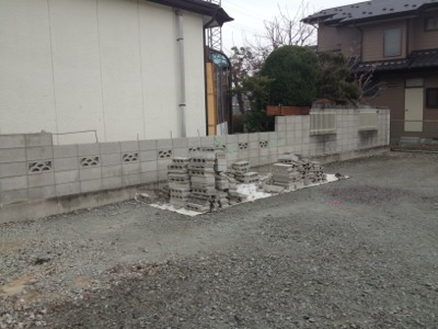 震災によって隣の家の壊れたブロック塀が積み重なっています。