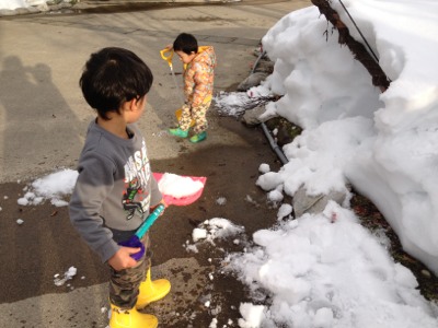 甥っ子たちと雪かきしています。 カンボジアの子どもたちにも雪を見せてあげたいなと思います。 南魚沼市 いまい