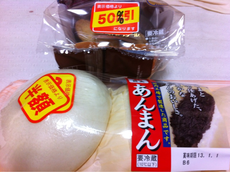 なので(?)今日は映画の帰り道、小代さんにおみやげ買って来ました。半額のエクレアとあんまんです。