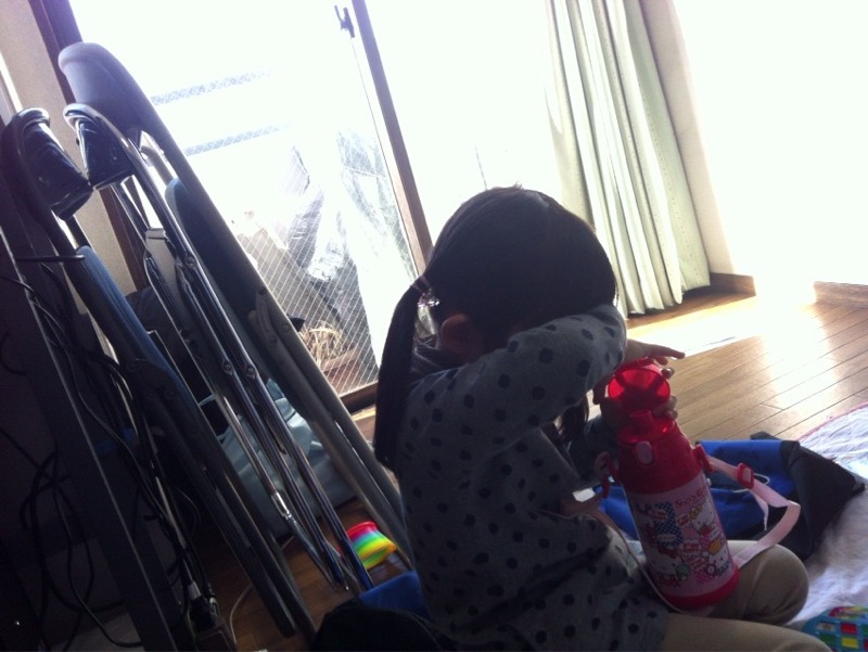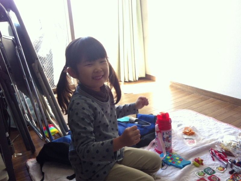 仲良し2人、床一面のおもちゃは、それぞれのリュックサックから出てきました。真ん中のおせんべいは、SくんがSちゃんに、いいよ!と分けてあげていました。 微笑ましいワンシーン、平和です。(エステル)