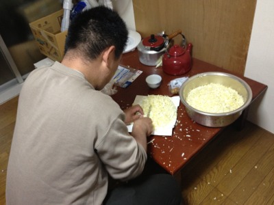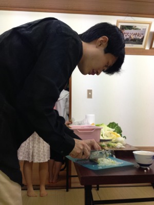 真剣な表情で白菜を刻む辻本さん。ぎこちない手つきですが、着実に白菜のみじん切りは増えています。