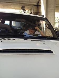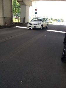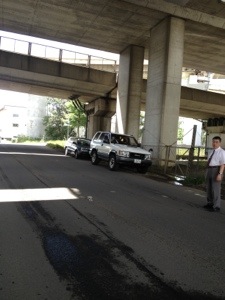 高架したに、なにやらあやしいのが二台。危険だ。 じつは、応募曲を選ぶため、車を止めているんだ。