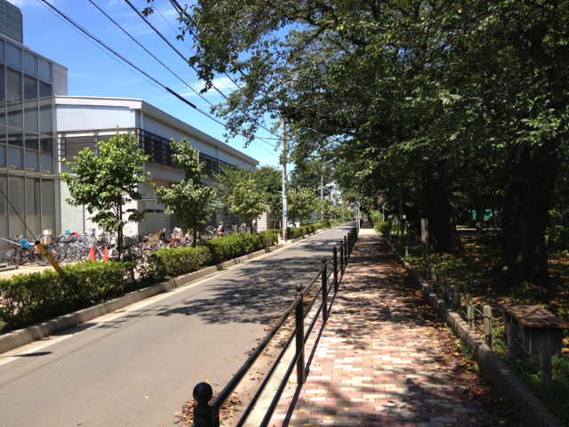 区のジム前の道で、時々、妻と散歩します。