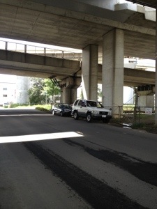 車はこんな所に止まっています。 後ろは、車の中でお昼寝をする、会社勤めの方。