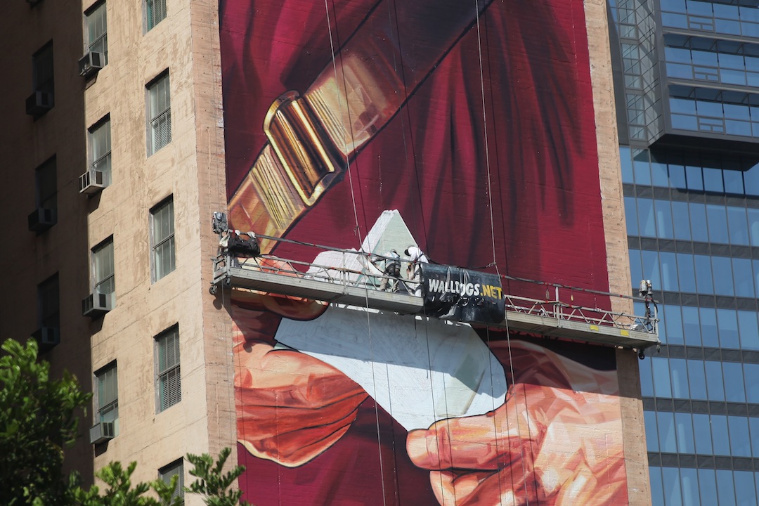 東一さんの車で移動していると巨大は映画の宣伝広告が貼り出されたビルディングが。よく見るとゴンドラに乗ってせっせと絵を描いています。んー、これは真似できません!