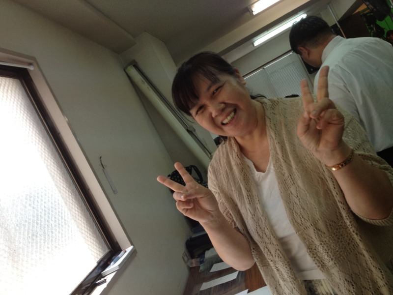 可愛くピースしている佐登子さん! 礼拝の楽譜の準備をされてます。