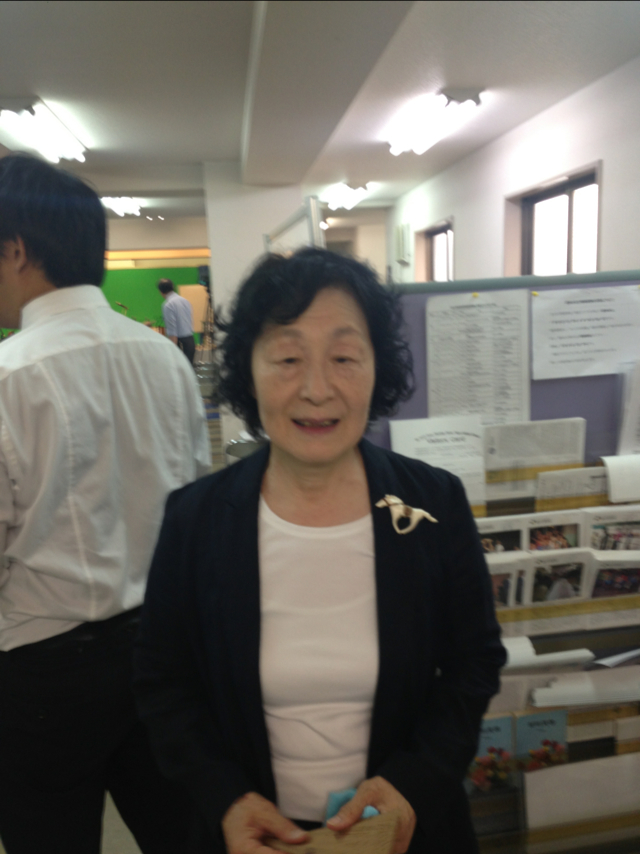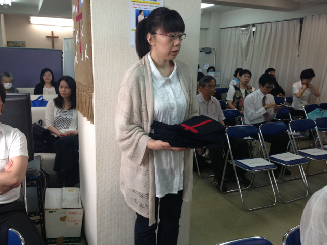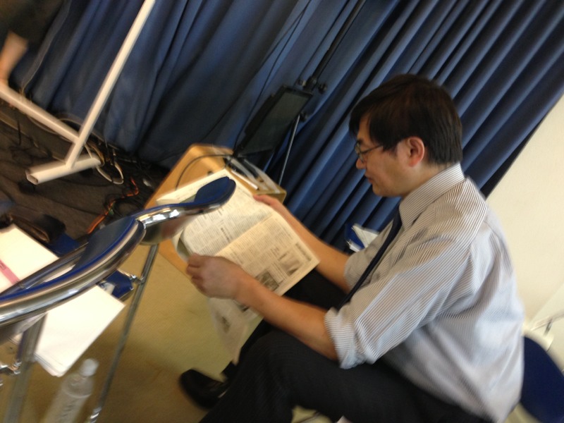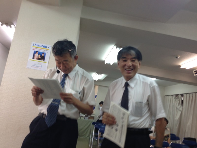 み声新聞を読まれるペテロ窪田牧師。でもなぜだか英字新聞に見えます?