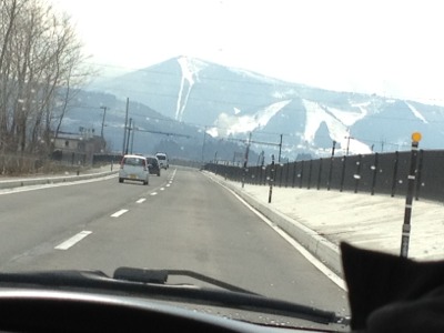 雪景色の山。これから東北の山々を通過して行きます。電波が届きにくくなる地域もあります。電話中に、プッツンと電話がきれてしまう事も。