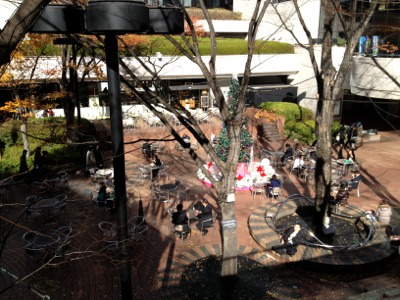ビルの隣には、カフェテラスがあります。