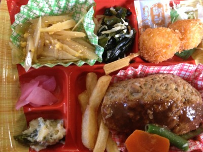 ゴスペルシードのヨセフです。 お昼になりました。今日のお昼はお弁当。 ハンバーグ定食。 これで390円!なかなかのものです。 ご飯が別に付きます。