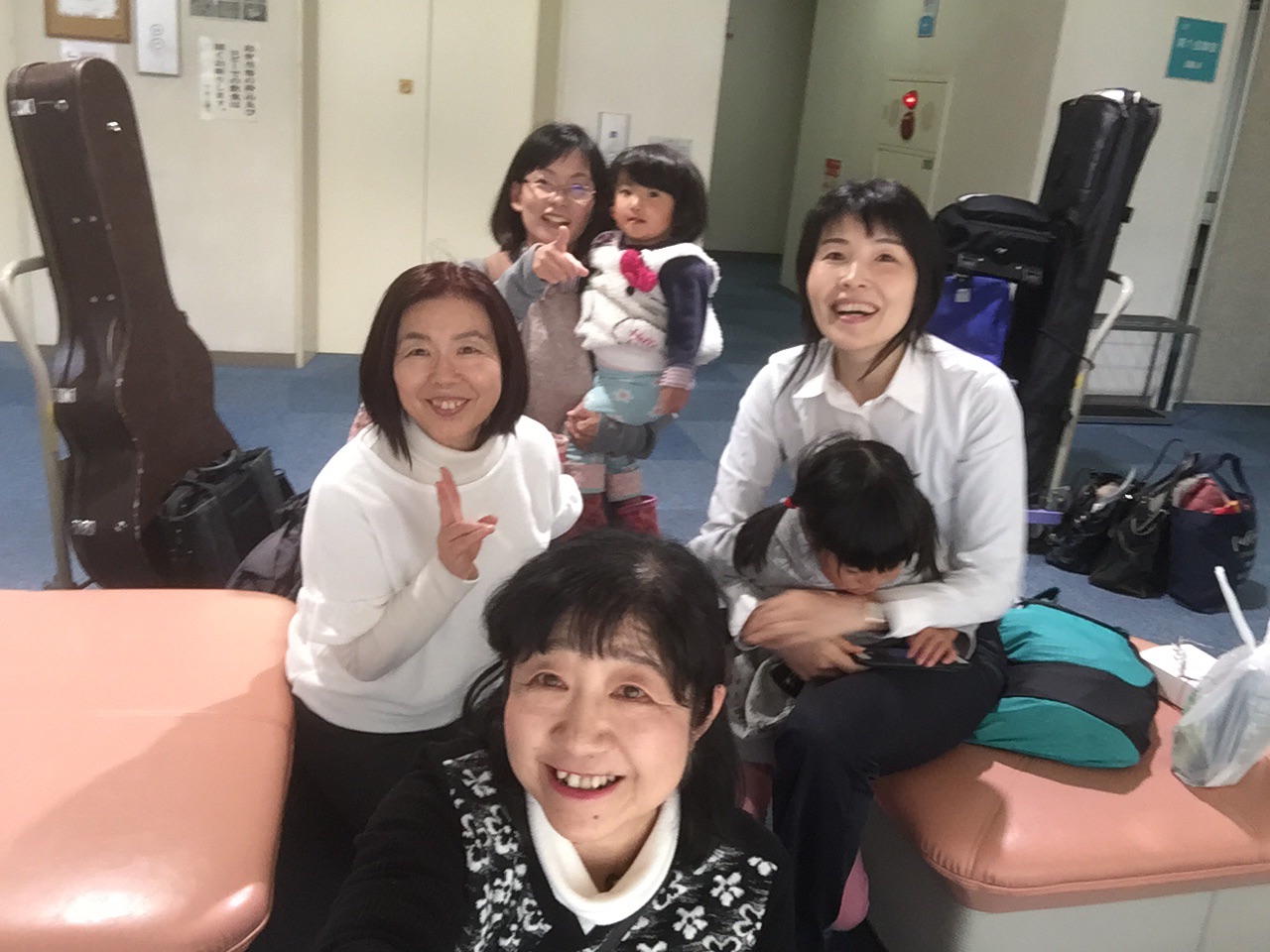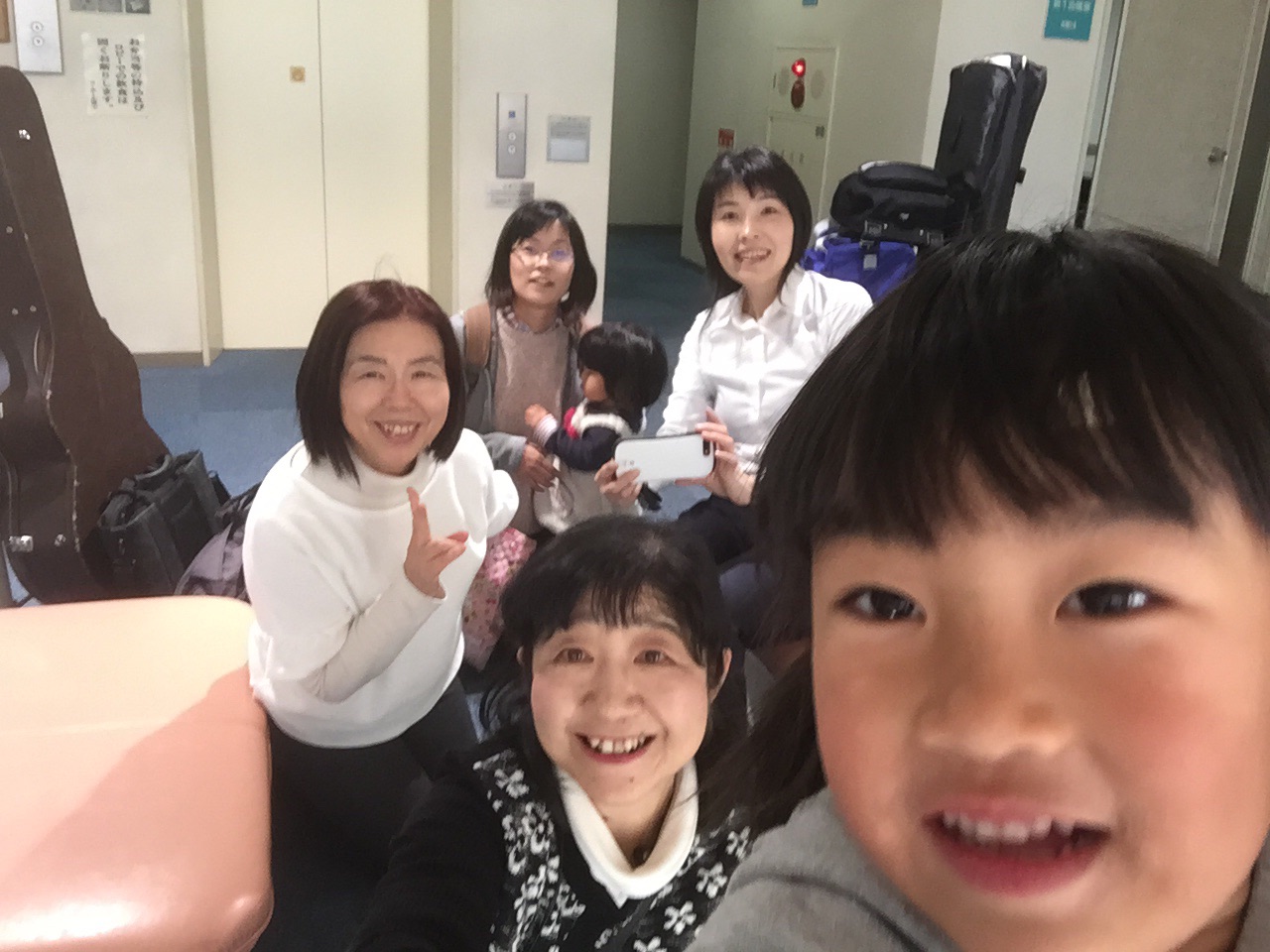 ボランティアコンサートへ向かう前にみんなてパシャ。キッズは元気でやんちゃ。のんちゃんわざと真顔です。