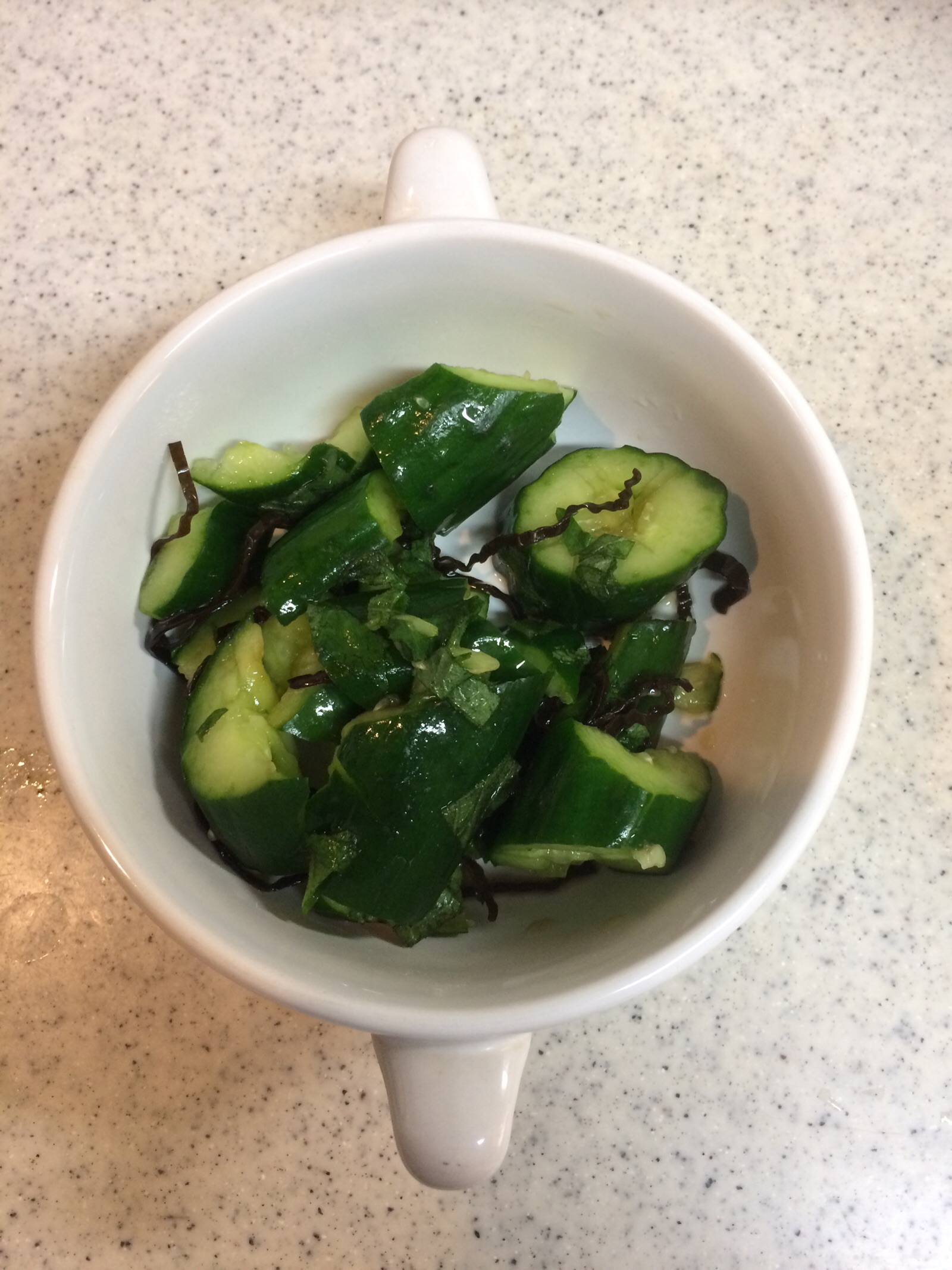 胡瓜の浅漬け。板ずりして叩いた胡瓜と細切り昆布とシソを混ぜて、軽く重石をした即席漬けです。 Hannah