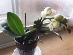 先日、たくさん蕾をつけた胡蝶蘭の枝を不注意で折ってしまいました。しかも、教会からお預かりしたものです。あ~っと思いましたが遅し、枝は折れ曲がり、なんとか皮(?)一枚でくっついている状態。感謝して、お祈りして、クリップで留めておきました。そうしたら どうでしょう!見事に 花が咲き始めました!!