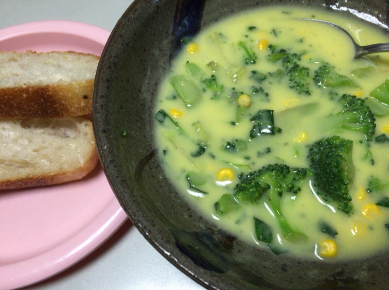 スペシャルコーンスープ&フランスパンをいただきましたー⤴︎⤴︎ 野菜たっぷりで美味しーぃです(*^◯^*)
