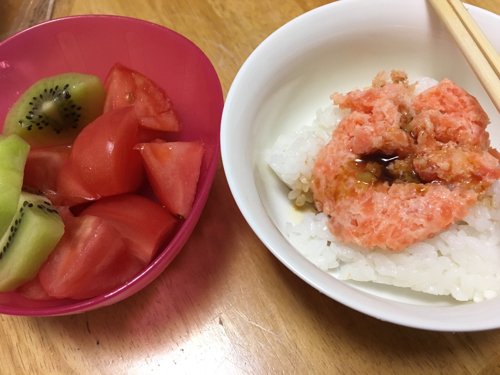 帰って来て、遅い夕飯です。 スーパーでサーモンのたたきが安かったので買って来ました。 Kayano