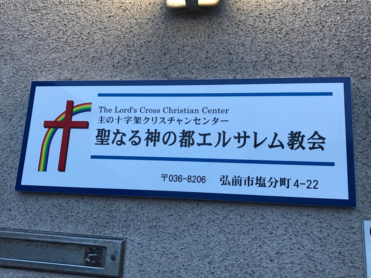 玄関に教会の素敵な看板があります。 小林は