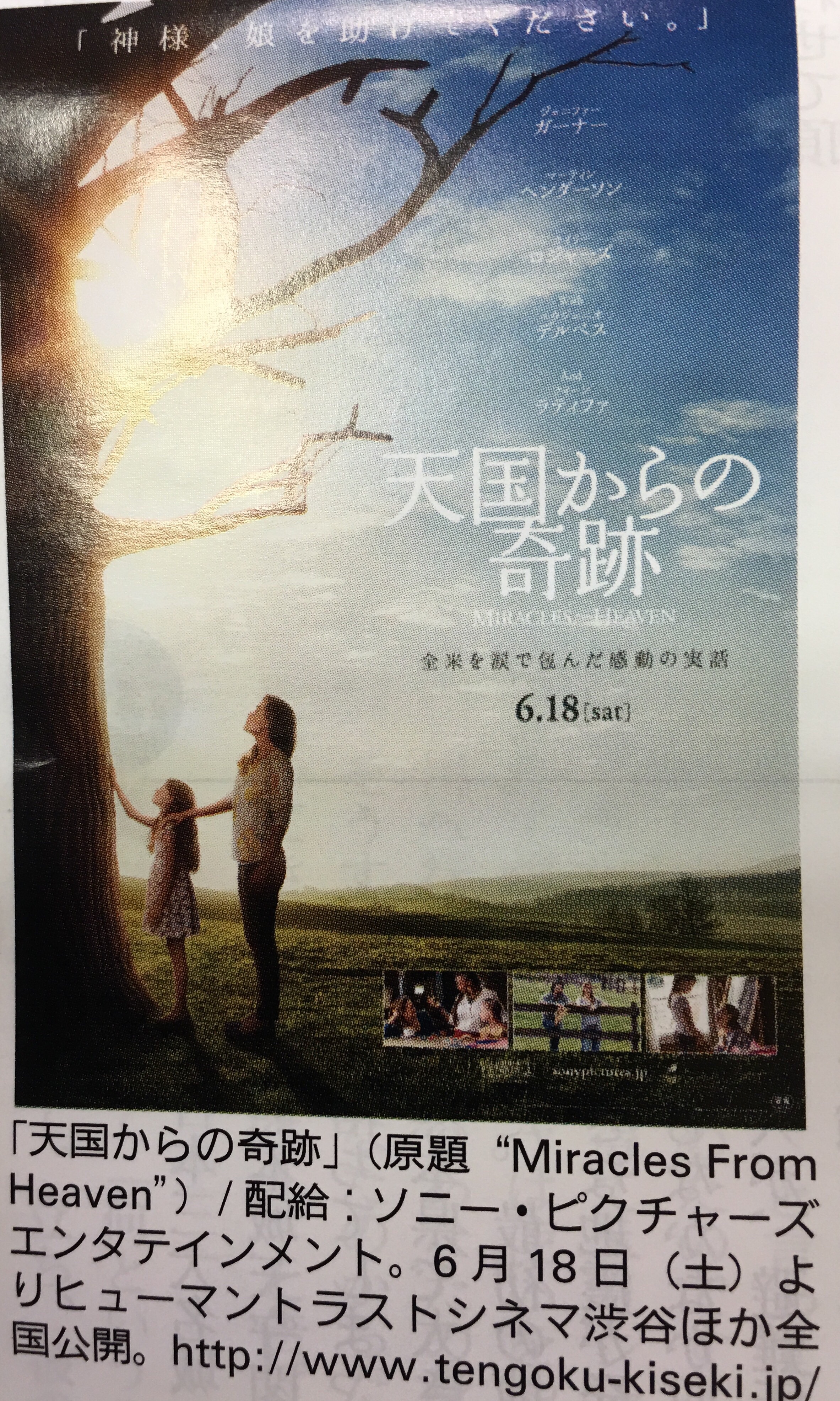 「天国からの奇跡」原題Miracles From Heaven 。去年、日本初の試写会に参加!これは凄かった、泣きました!2回観て2回泣きました。実話であるから凄い!兵庫では映画を観たら2人の方がイエス様を信じたそうです。peter