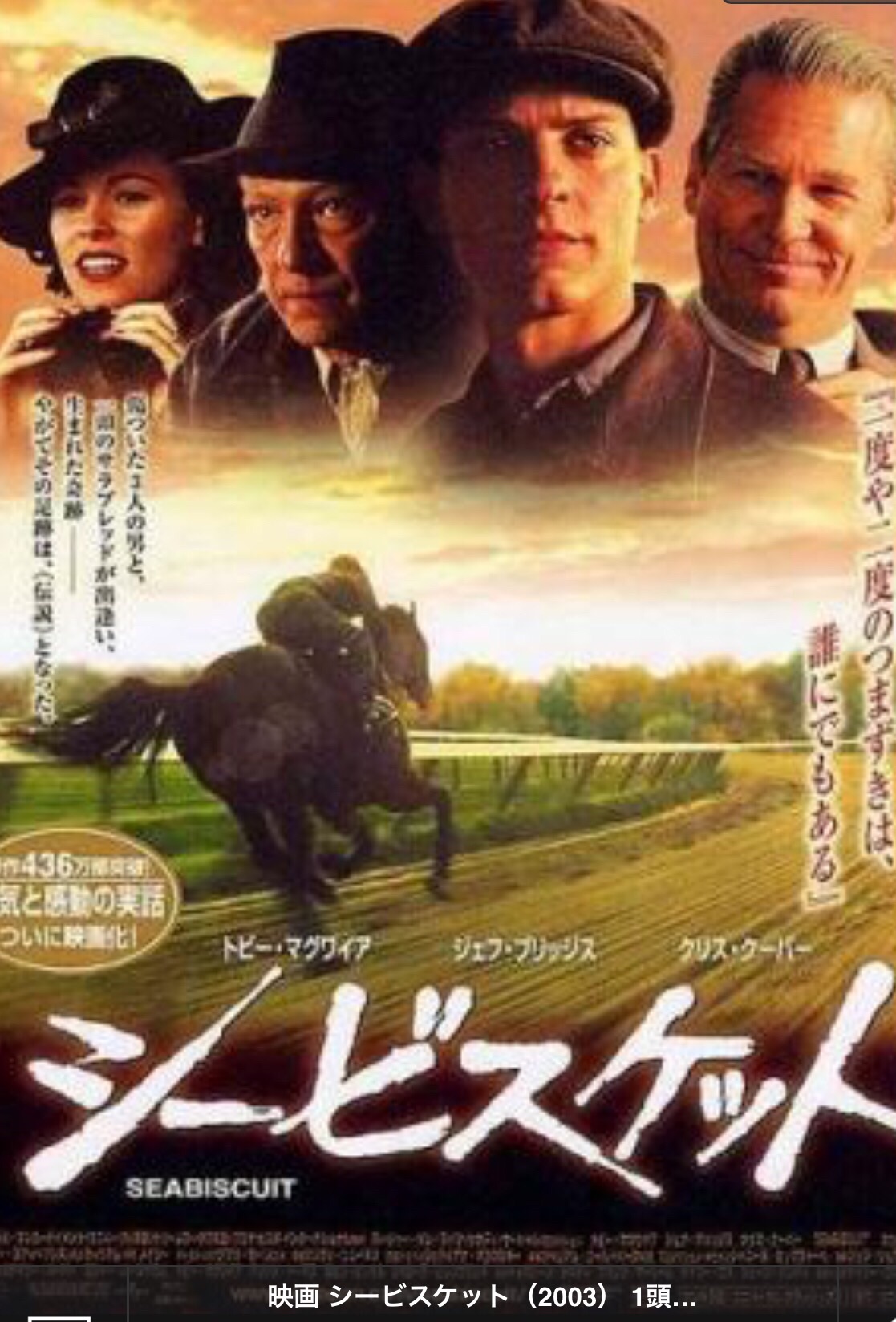 シービスケットとは、実在した、競走馬。そのシービスケット、騎手のレッド(トビー・マグワイヤー)、調教師(クリス・クーパー)、馬主(ジェフ・ブリジッス)、挫折した皆がとひとつになってカムバックを目指す。ラストで、映画にはこんなチカラがあるんだ!と感動。peter