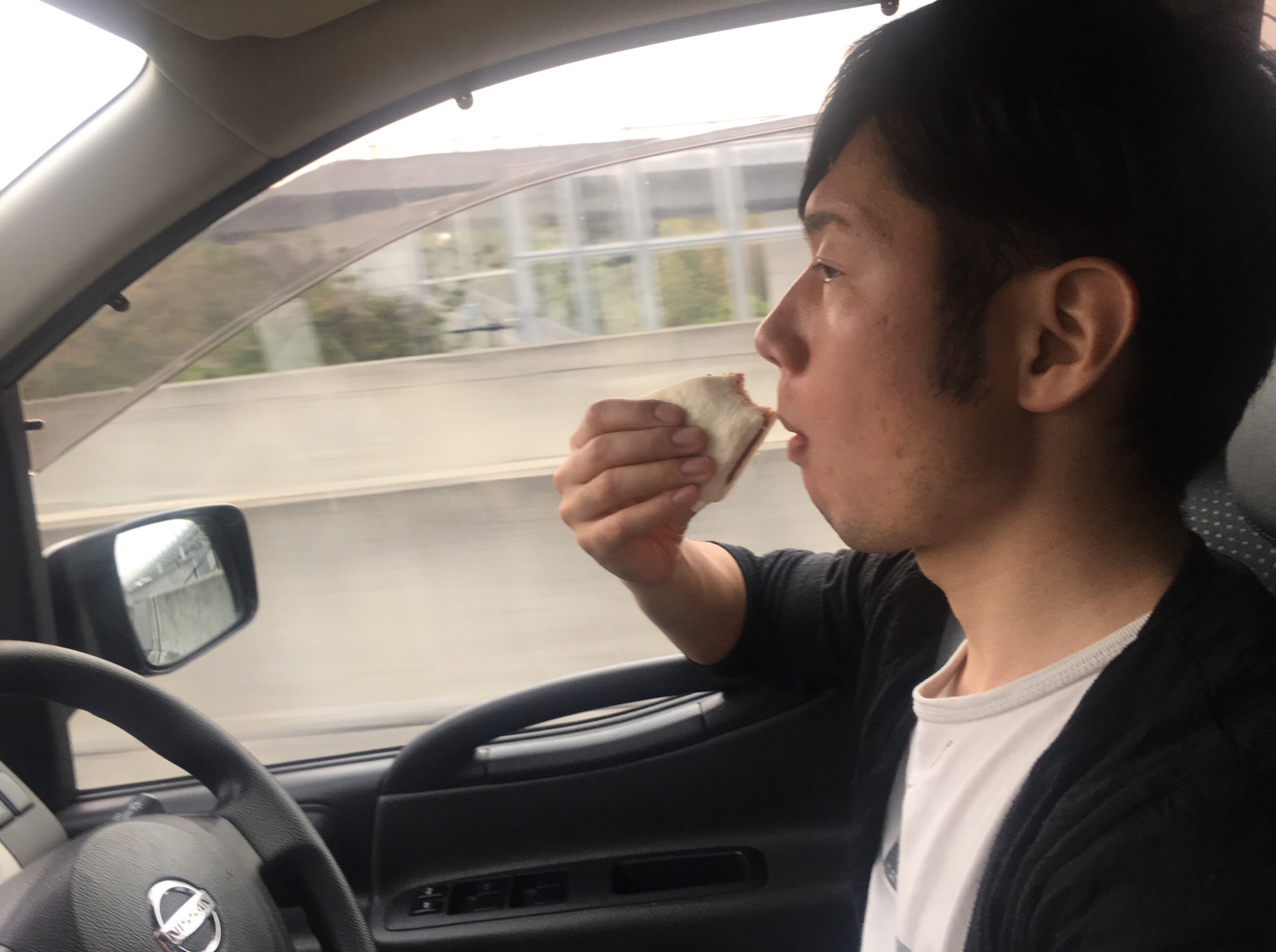 朝、買ったハムカツサンドを食べるダビデくん!運転がんばれ〜!
