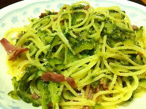 今日のお昼は、ゴーヤを使ったパスタです。苦いのが苦手な夫も食べてくれてます。 合格かな?