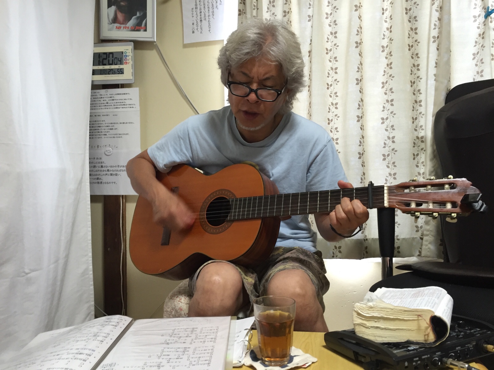 火曜礼拝で、新曲を賛美するオネシモさん。