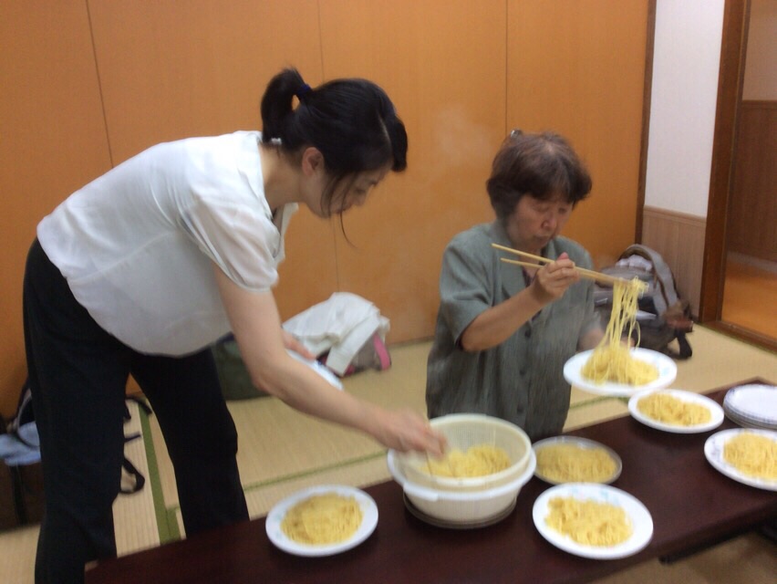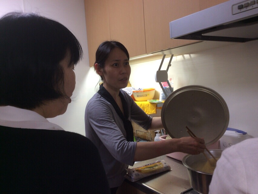 暑い中、スパゲティーの麺を茹でます。「何人前?…」などと話しています。tukawaki