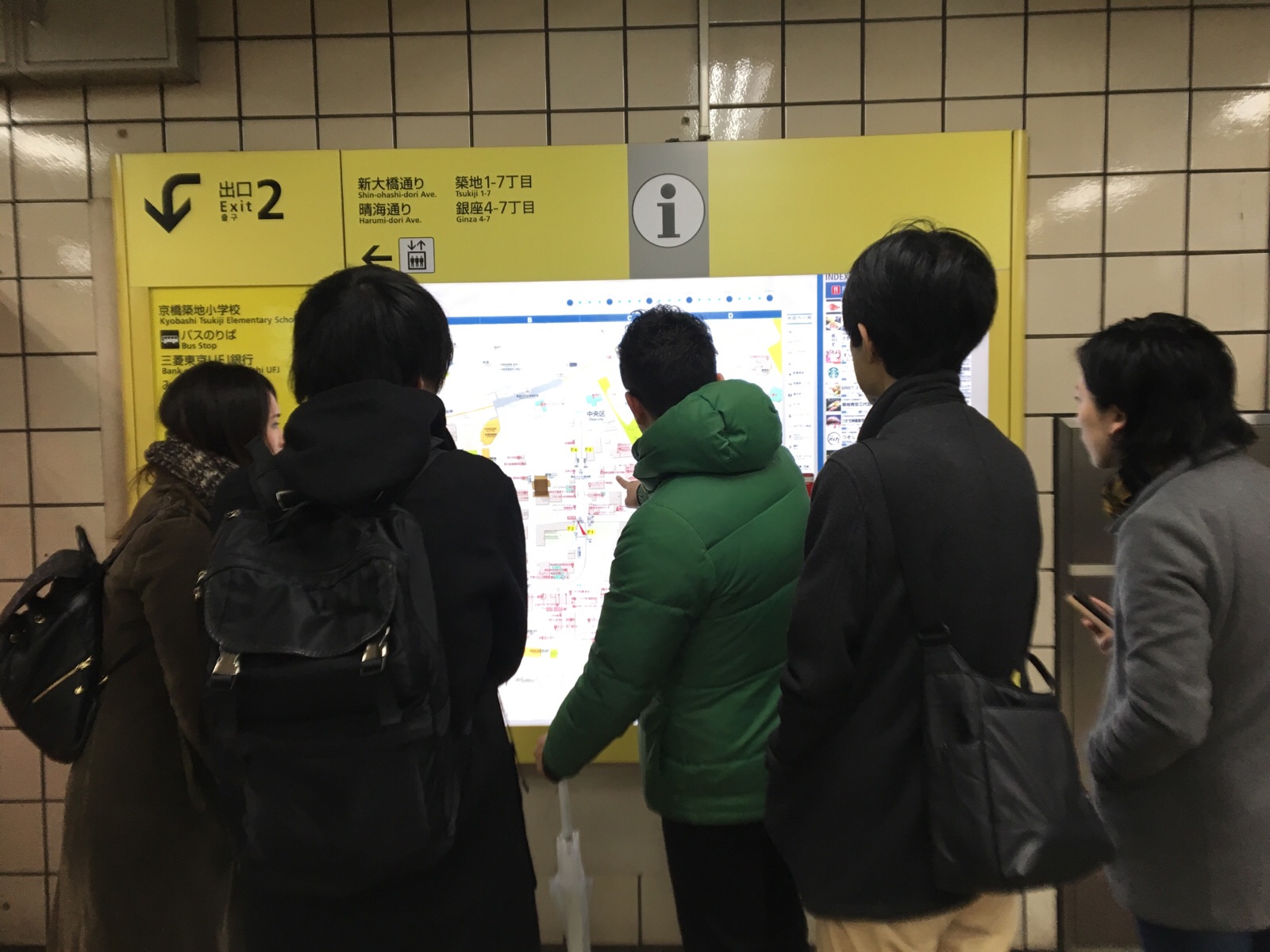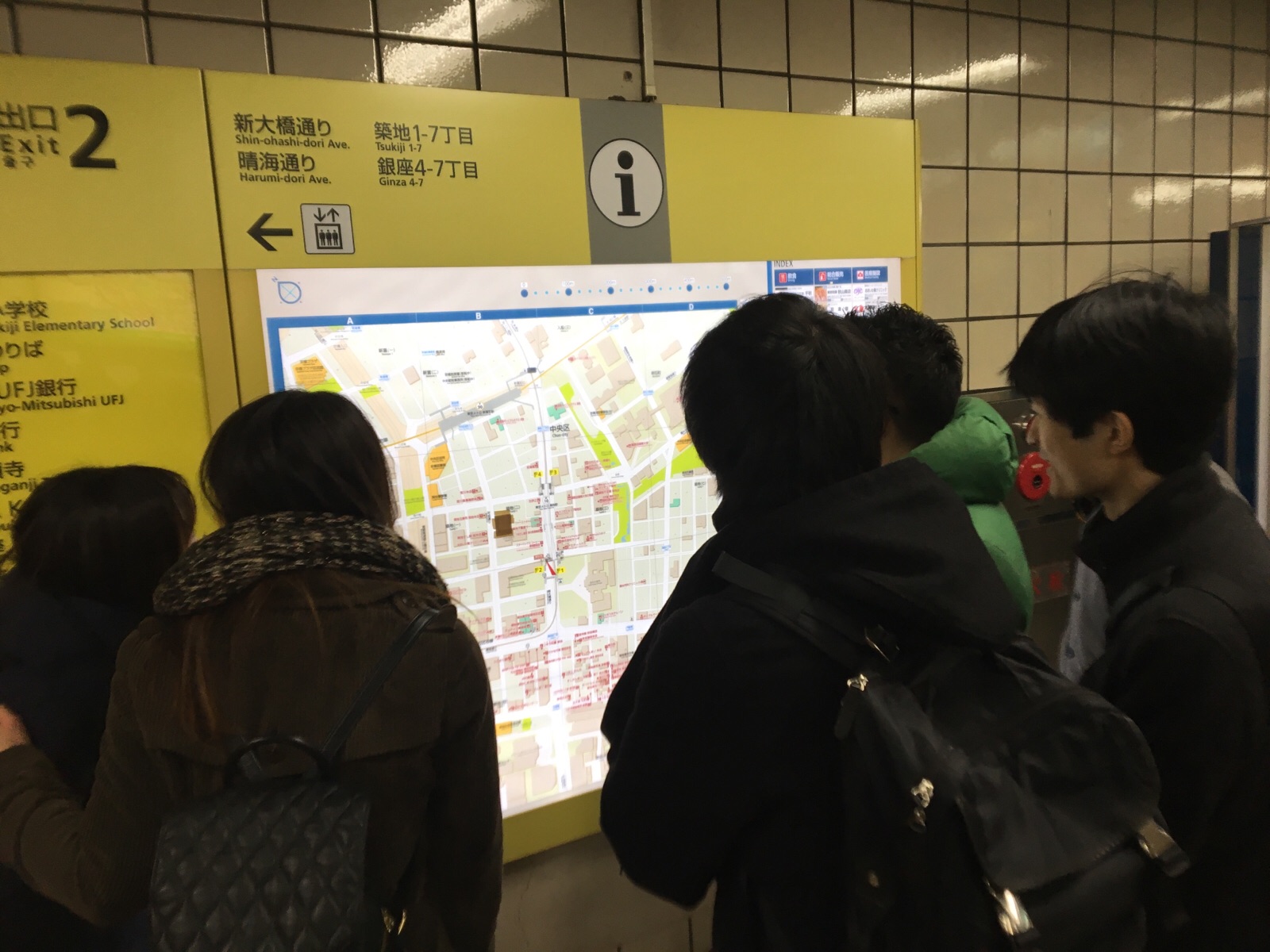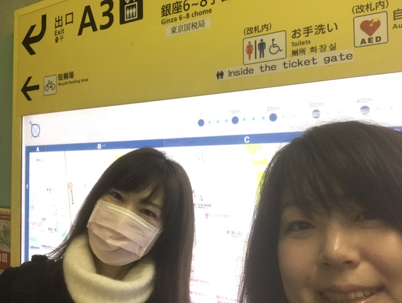 まゆなちゃん到着〜。えっ?やっぱあっちで待ってたの?^ – ^築地駅なかなかわかりにくいかも。