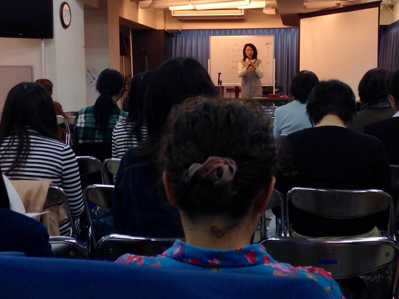 船橋聖会でメッセージをしている秋元さん。新しい働きに入って行く事をお話しています。