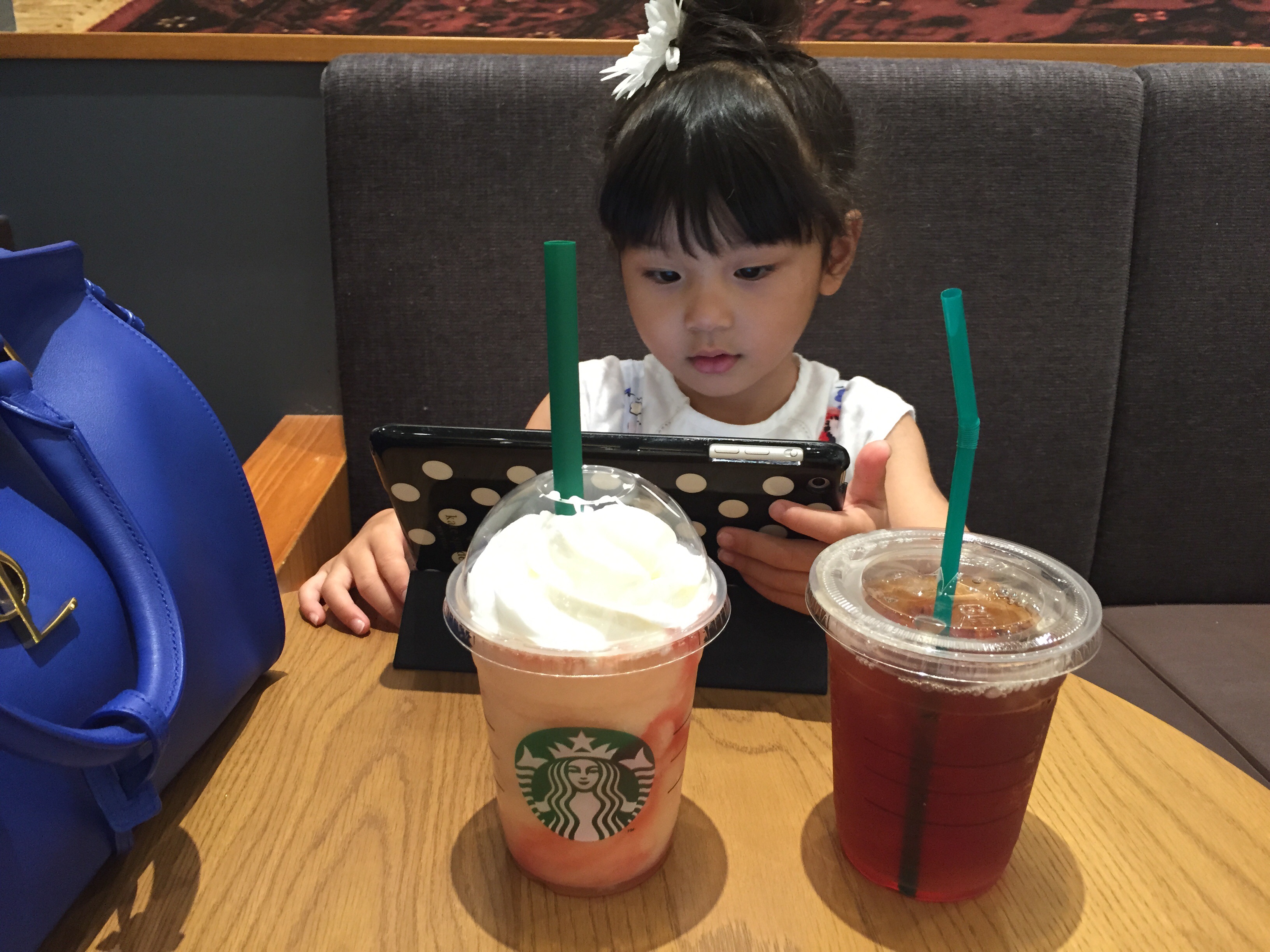 スタバで休憩〜(* ˘ ³˘) 私はピーチ イン ピーチ♡ みーちゃんはアイスティー♡ 主人がこのブログを見たら拗ねるかも??笑
