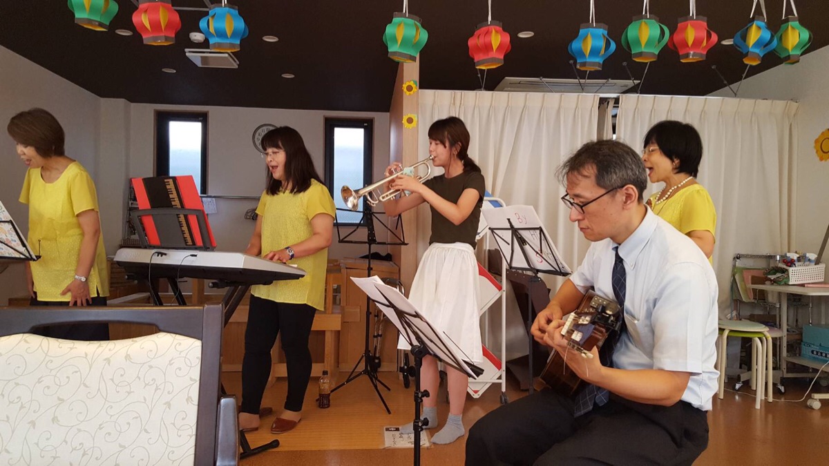 2曲目は、『憩いの水のほとり』を賛美しました。最初は少し戸惑い気味に見えた利用者さんも、どんどん曲に引き込まれているのが見えます。