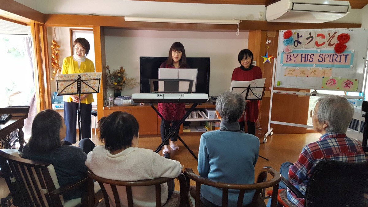 3曲目は『御国を想いで』を賛美しました。目を閉じてじっと聞き入っておられます。 軽い認知症と思われる利用者さんたちも、真剣に聴いてくださっているのがわかります。