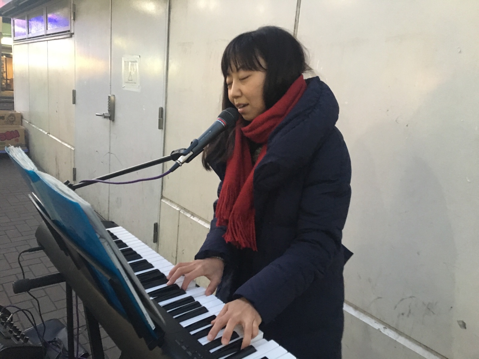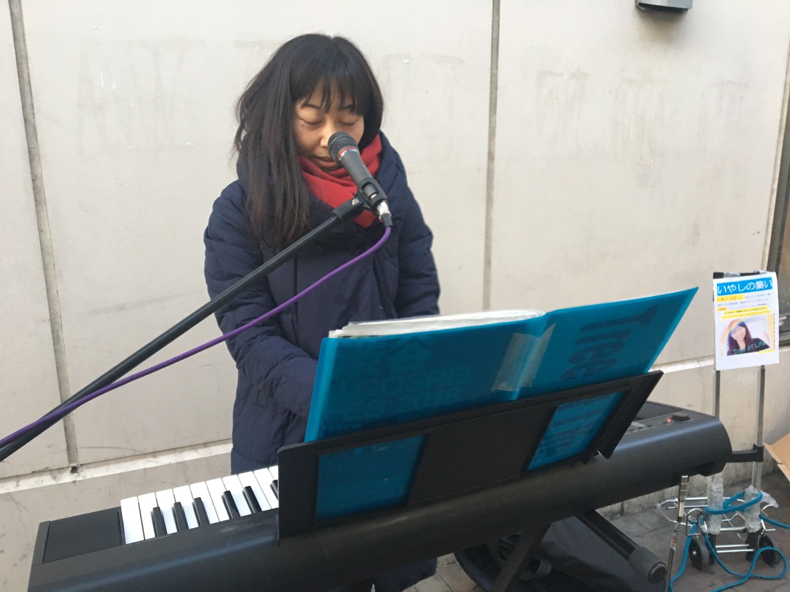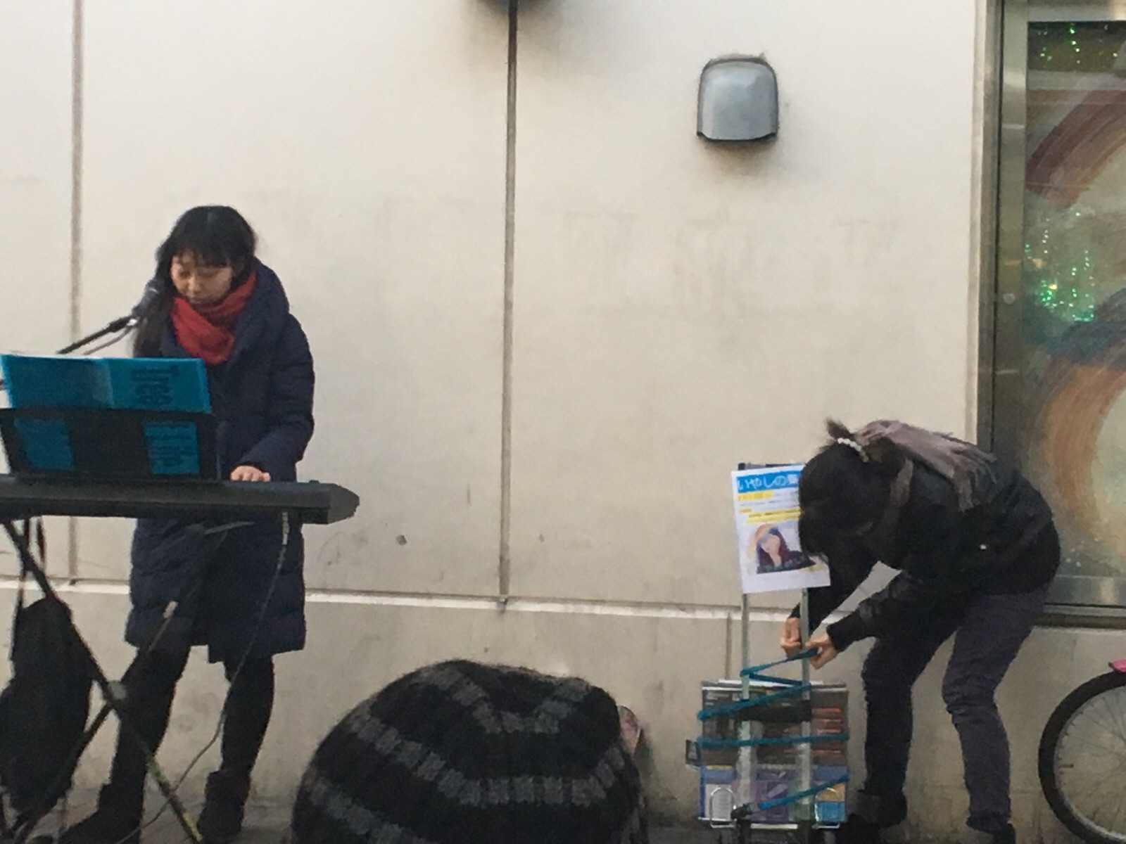 高円寺南口駅前で、いやしの集いの宣伝路上ライブが行われています!始めの曲は、花♪エステル清水